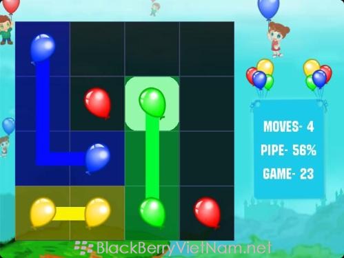 Một thể loại trò chơi vui nhộn danh cho các dòng máy BlackBerry OS, bạn sẽ được cung cấp những trái bóng bay với nhiều màu sắc khác nhau, nhiệm vụ của bạn là tìm đường đi cho những chiếc bóng bay đó có thể gặp được nhau để kết nối bạn bè gắn kết yêu thương, cho dù trò chơi có tính năng giải trí nhẹ nhàng nhưng đôi khi bạn sẽ phải giải những bài toán về đường đi cho những trái bóng, vì chúng không chấp nhận đường đi chạm nhau mà phải xuyên suốt vì thế bạn cần phải động não. Thuộc thể loại game trí tuệ với bố cục trò chơi vui nhộn cùng đồ hoạ ngộ nghĩnh chắc chắn sẽ làm bạn hào hứng và thích thú khi chơi. Một điểm nhấn nữa đó là số lượng màn chơi phong phú phân theo từng cấp độ từ dễ, vừa đến khó. Vì thế bạn hãy nhanh tay trải nghiệm nhé. Một số hình ảnh trò chơi trên BlackBerry 9900: Thông tin về trò chơi: Download: (Bộ cài trang apps.bbvn.net dành cho dòng máy 9900/9930/P'9981) Tất cả các dòng máy BBOS: BlackBerryVietNam.net