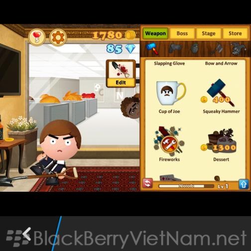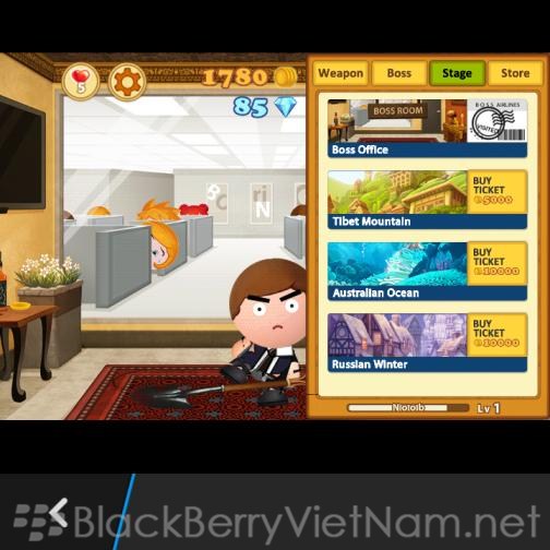 Beat the Boss 3 là một game xả Stress rất vui nhộn. Với hơn 50 triệu lượt tải chứng tỏ trò chơi rất cuốn hút. Bạn ghét sếp của bạn, muốn "bụp" một trận cho bõ tức hay chỉ đơn giản bạn bị stress cần giải trí thì quá đơn giản, tải game về và chơi để lấy lại tinh thần. Trò chơi khá đơn giản, bạn chỉ việc tấn công ông sếp bằng mọi thứ mình có như xẻng, chai rượu hay đên nhưng vũ khí hạng nặng như súng ống, tên lửa.... Qua mỗi màn chơi bạn sẽ nhận được tiền để mua và nâng cấp vũ khí của mình. Mỗi vũ khí khi sử dụng đều có những hiệu ứng đặc biệt, hình ảnh hài hước. Game được mình chơi thử trên BB Q10 Rom 10.2.1.1055 Một vài hình ảnh trong Game: Chỉ dùng tay Hay dùng xẻng Mua thêm vũ khí Thêm môi trường mới Thông tin trò chơi Download BlackBerryVietNam.net
