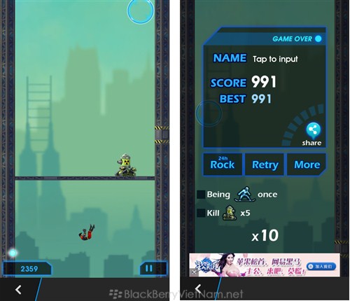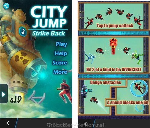 Game CJ: Strike Back - Người ngoài hành tinh đang xâm nhập, thời gian để tấn công không còn nhiều, cần phải có tốc độ thật nhanh và nhiều thử thách. Trong game bạn hóa thân thành một siêu anh hùng, giúp cho trái đất tránh khỏi được sự tấn công của những thế lực đen tối. Đó là thời gian cho con người để tấn công trở lại Chuyển đến chiến đấu chống lại quân đội cơ giới, giết chết ông chủ của người ngoài hành tinh, và đạt được tất cả các nhiệm vụ để tiết kiệm thành phố! Hình ảnh trong game Cách chơi : • Chạm màn hình để chuyển đến tiêu diệt kẻ thù. • Giết 3 kẻ thù cùng loại để tăng sức mạnh. • Giết ông chủ cho thêm tiền thưởng. • Đạt được bổ nhiệm làm nhiệm vụ để có được điểm số cao hơn. Thông tin trò chơi Download BlackBerryVietNam.Net