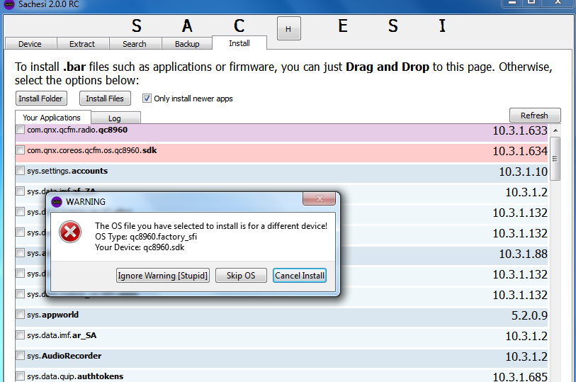 Load file core + radio + all app rom 10.3.2.858, xuất hiện thông báo lỗi core, chọn (stupid) =))