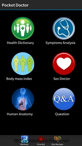 Ứng dụng 'Pocket Doctor' do BigStudio phát hành. Ứng dụng là kho thư viện bỏ túi tư vấn về các vấn đề sức khỏe cho người dùng. Trong ứng dụng có rất nhiều lựa chọn khác nhau như tư vấn sức khỏe, chấn đoán tình trạng cơ thể hay tính chỉ số BMI của bạn, ngoài ra ứng dụng còn có các bài tập thể dục kèo theo ở chức năng 'Workout' hay cung cấp các số điện thoại khẩn cấp của các nước khác nhau trên thế giới ở chức năng 'First Aid'. Chức năng 'Diet Recipes' sẽ cung cấp cho bạn các công thức nấu ăn cho việc giảm cân. Các chức năng của ứng dụng: Giải đáp các thắc mắc về sức khỏe của bạn Chuẩn đoản các vấn đề về cơ thể Có các hướng dẫn về các bài tập thể dục vận động cơ thể Cung cấp số điện thoại khẩn cấp của các nước trên thế giới như cấp cứu. công an hay cứu hỏa Cung cấp công thức nấu ăn cho chế độ ăn kiêng Một vài hình ảnh của ứng dụng: Thông tin về ứng dụng: Download BlackBerryVietNam.net
